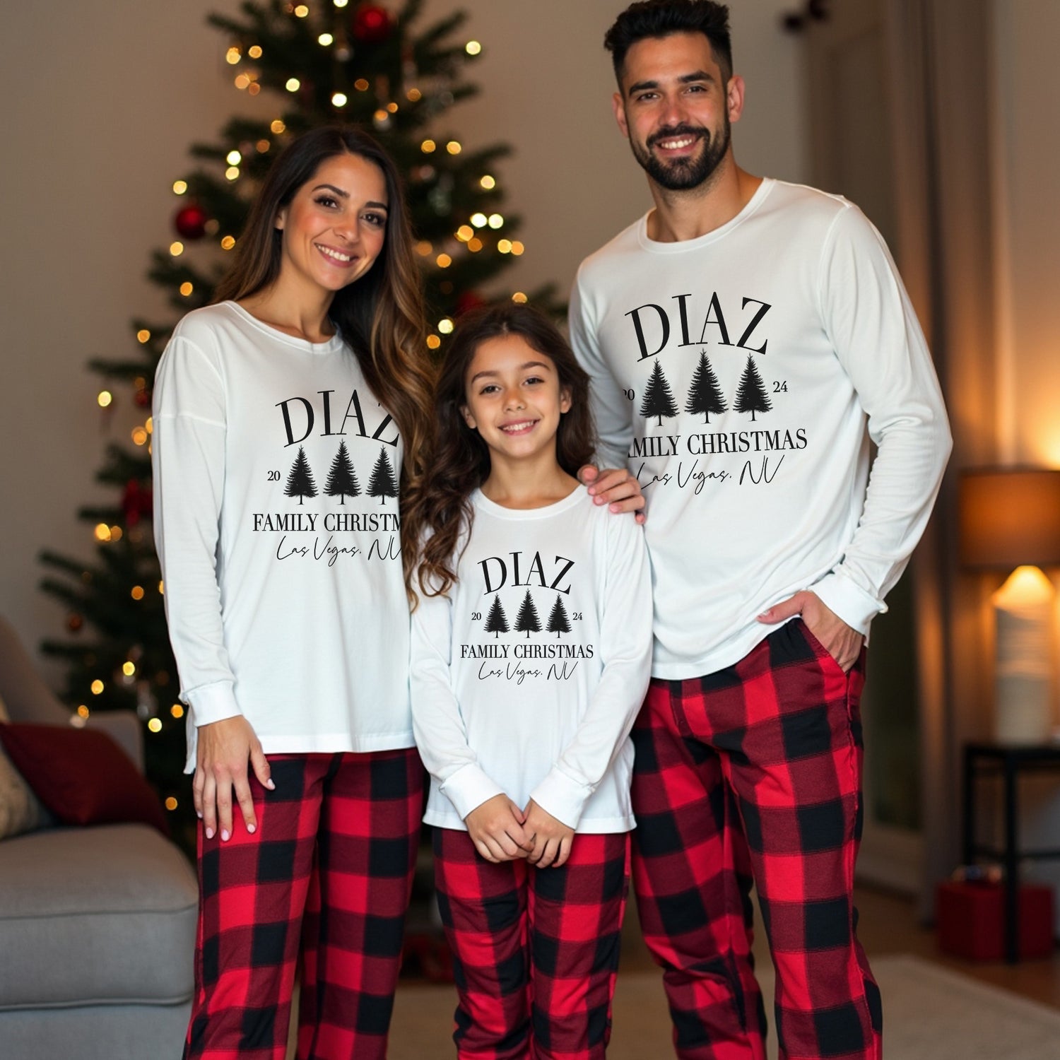 Make this holiday season extra special with our Personalized Matching Family Christmas Pajamas Set! Available in sizes YXS-2XL, these matching Christmas pjs includes a cozy sweatshirt, t-shirt, long sleeve, or hoodie and plaid pajama joggers. Perfect for Christmas morning and family photos, personalize the Christmas pajamas with your families last name and where you're spending the holidays for a unique touch. Not only is this Christmas pajama set great for family it is great for friends, groups, couples, coworkers, and more. This set is absolutely perfect for Christmas vacation. Spread the joy and get matching PJs for the whole family!