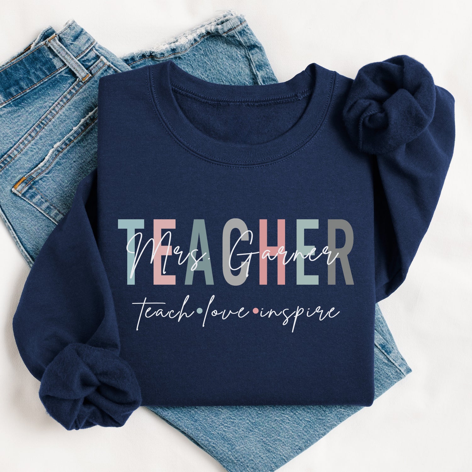 Personalized Teacher Sweatshirt with Last Name, Birthday Gift for Teacher, Custom Teach Love Inspire Crewneck