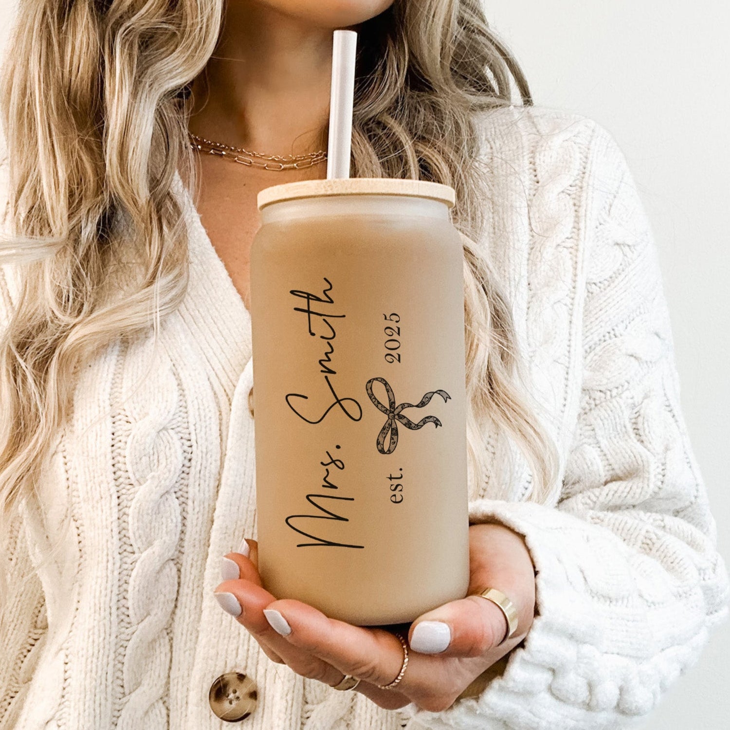 Celebrate the future Mrs. with our Personalized Wifey Glass Iced Coffee Cup, the perfect bride-to-be gift that blends style, function, and customization. This trending 16oz iced coffee tumbler is available in both clear and frosted glass, featuring a secure bamboo lid and reusable straw—ideal for iced lattes, matcha, or cold brew on the go. It’s a must-have for bridal showers, bachelorette parties, and engagement celebrations.