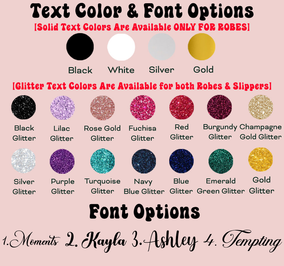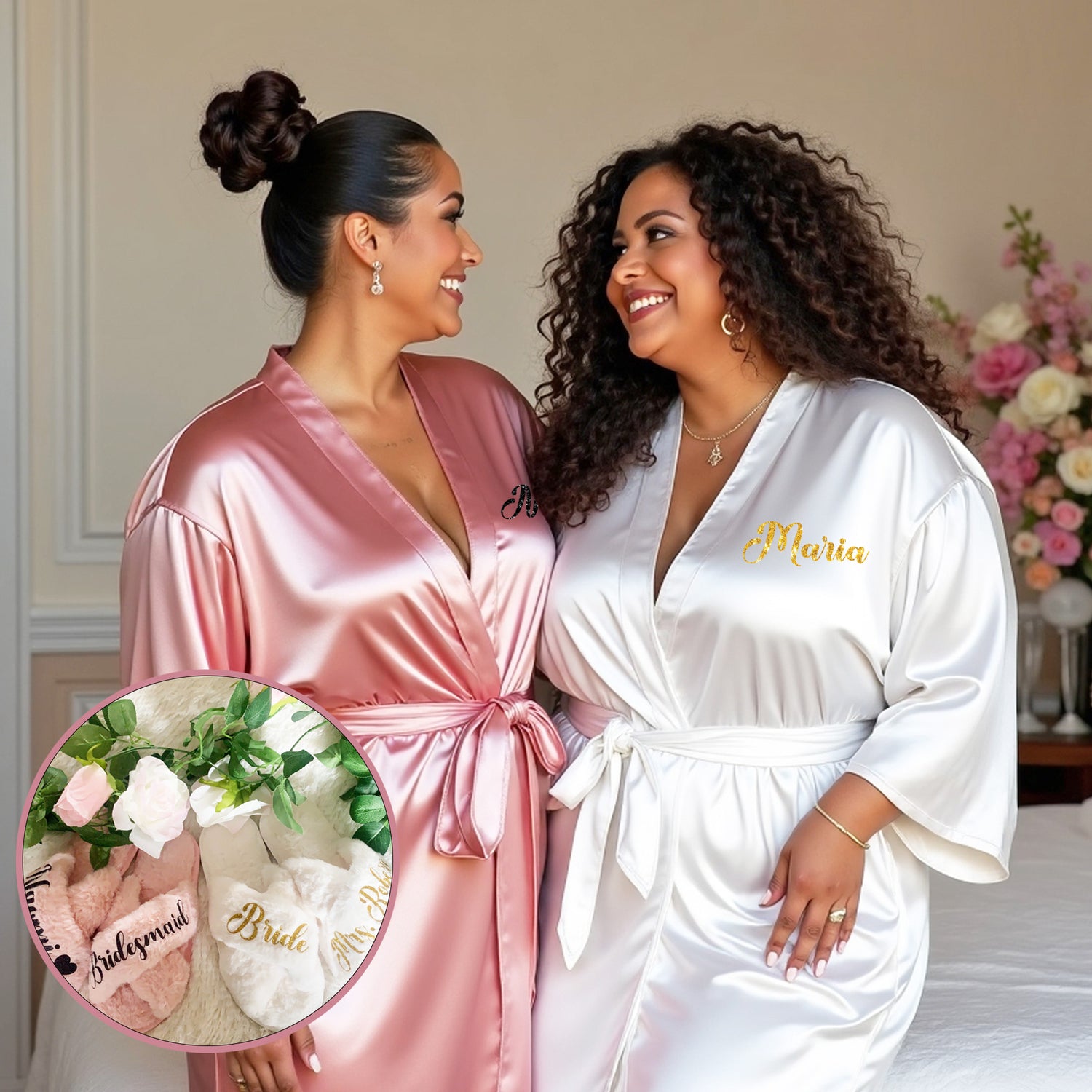 Indulge in luxury with our Personalized Women Robes and Slipper Set. Perfect gifts for wife on anniversary & birthdays, girl's trips gifts and favors, bridesmaid proposals, and getting ready for the wedding day. These cute and comfy robes and slippers are the ultimate gift for her. Our satin robes are available in 26 trending colors and sizes S/M, L/XL, XXL, 3XL/4XL and 5XL/6XL, with matching child sizes available. Use as bridesmaid proposal gift sets to pamper your bridesmaids and say thanks with style!