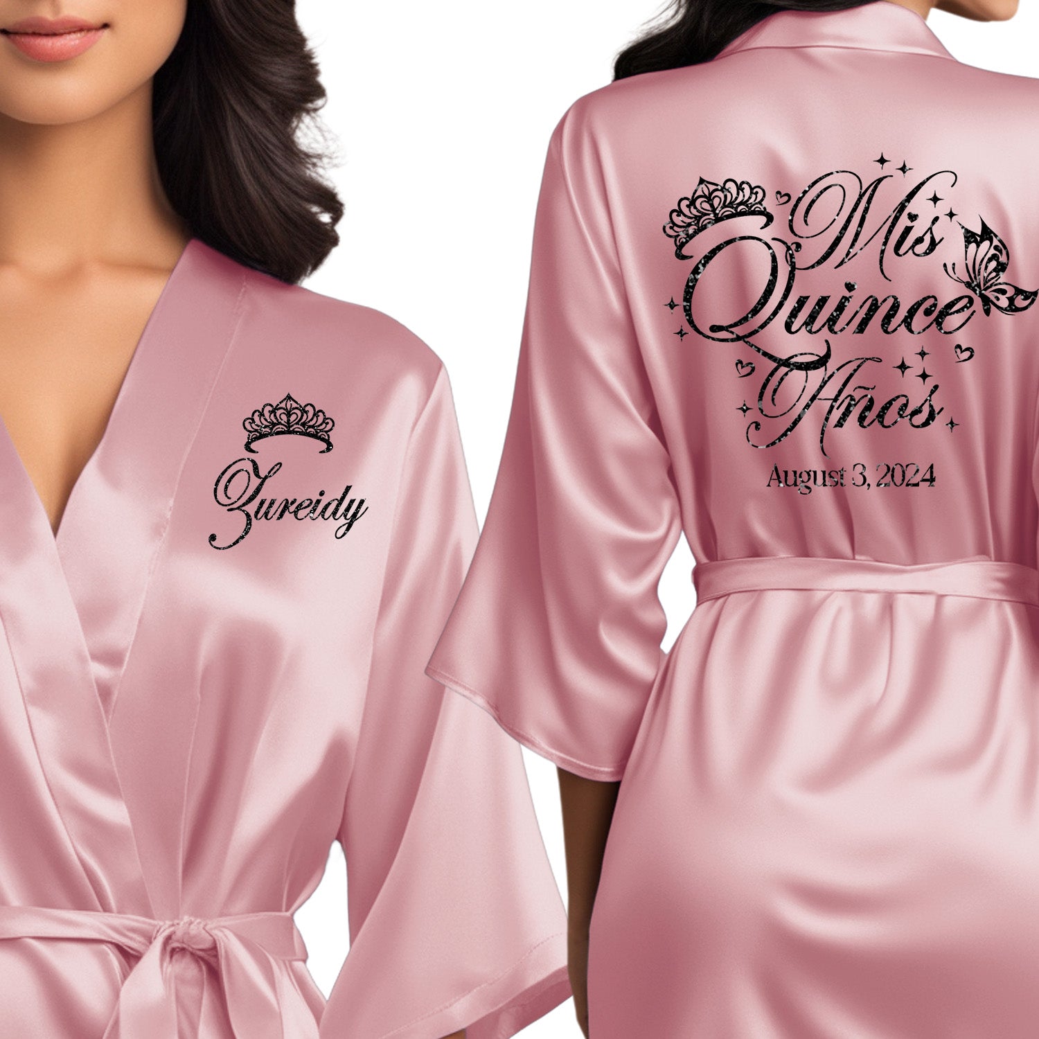Step into your Quinceañera celebration in style with our Personalized Satin Quinceañera Robe. Crafted for your special day, this personalized Quinceañera robe exudes luxury and elegance. Ideal for getting ready moments and capturing unforgettable photos, it features beautiful glitter and regular text color options to match your Quinceañera party. Perfect for your Quince birthday, our personalized robe is a symbol of sophistication and grace as you embark on this milestone journey. Make your Mis Quince celebration truly memorable with our personalized robe for every member of the party. chose from Mis Quince Anos, Mama de la Quinceañera, Abuela de la Quinceañera, Tia de la Quinceañera, Hermana de la Quinceañera, Quinceañera Squad, Damas de la Quinceañera  and more.