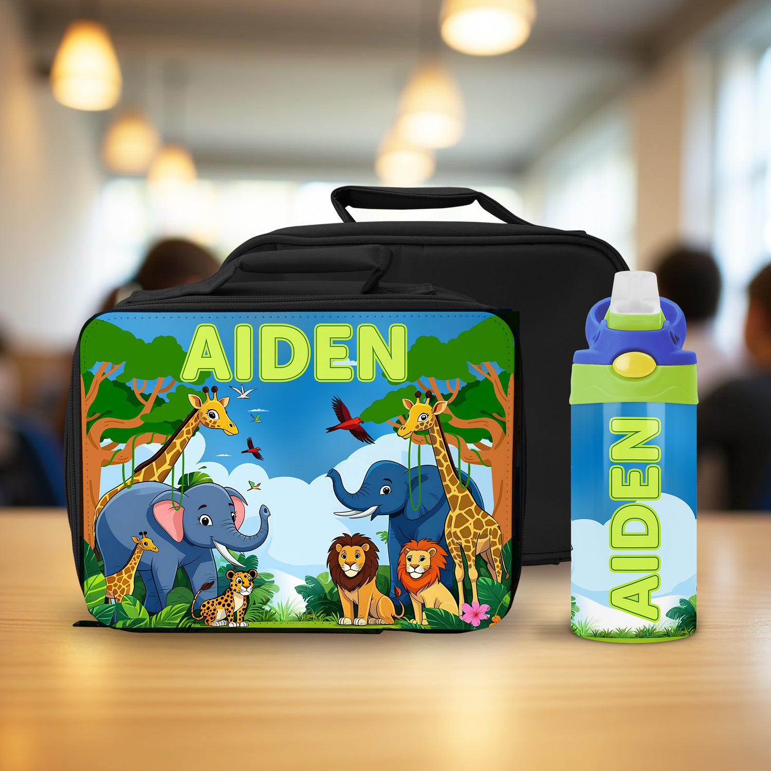 Safari Lunch Box and Water Bottle with Name, Custom Kids Back to School Lunch Set
