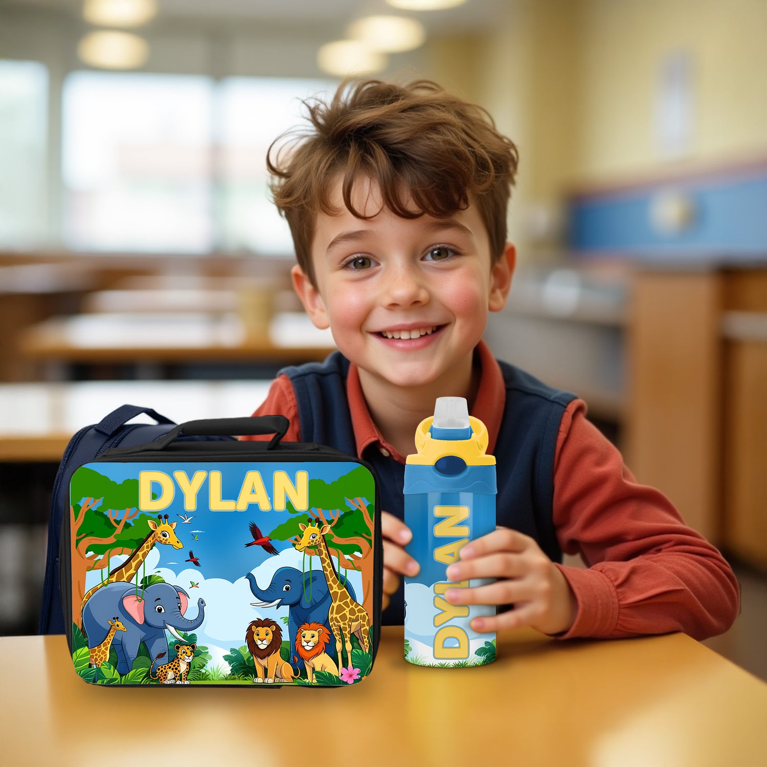 Whether you're shopping for a personalized lunch box for boys, a custom school water bottle, or unique personalized back to school gifts, this safari-themed set delivers the perfect blend of style and function.
