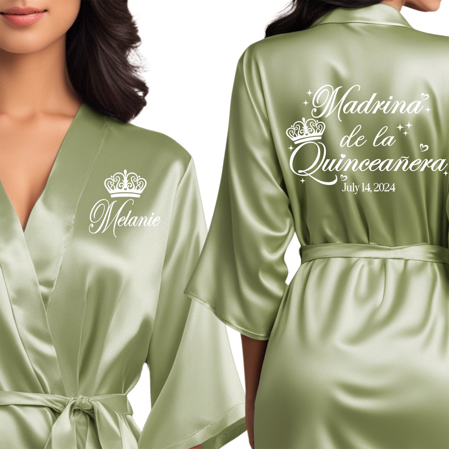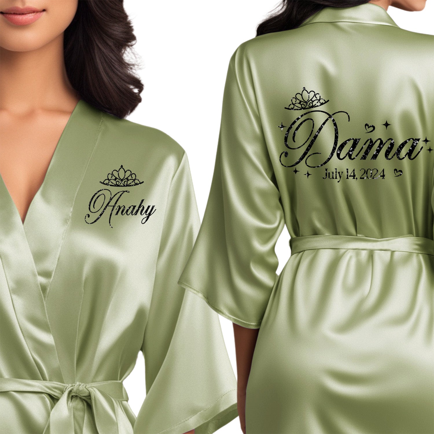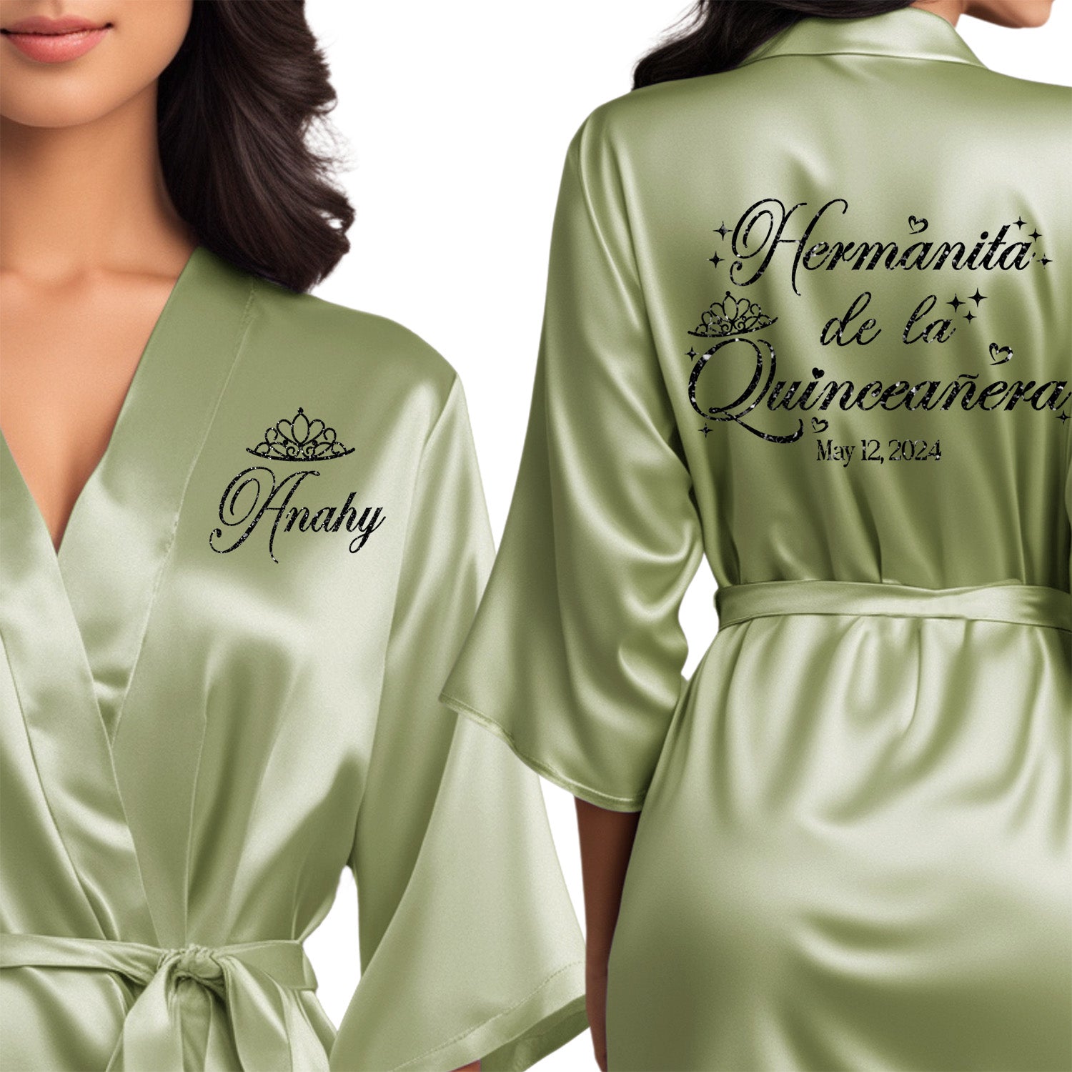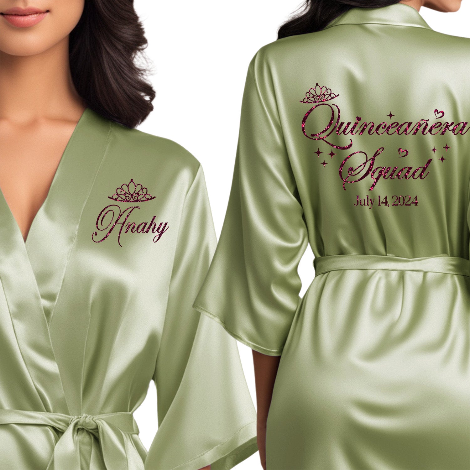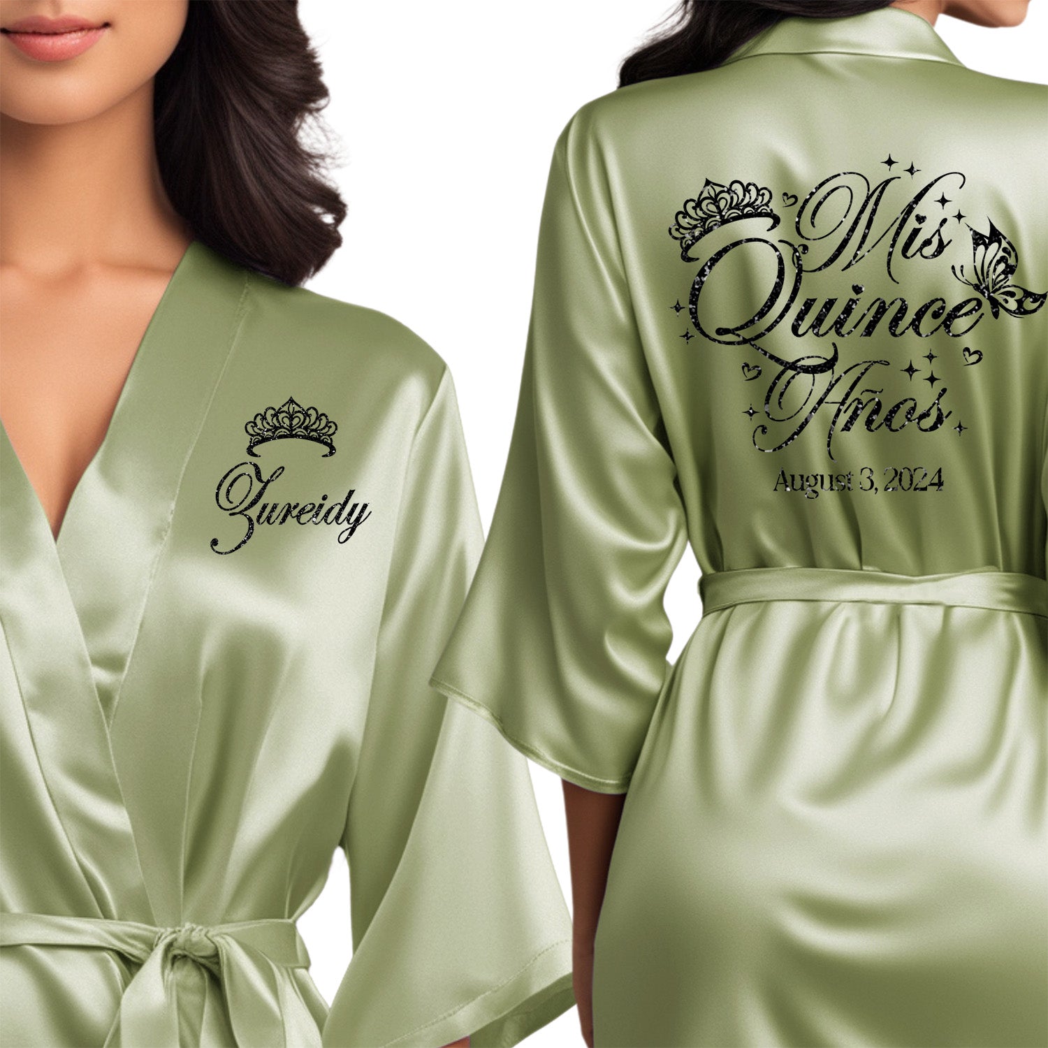 Step into your Quinceañera celebration in style with our Personalized Satin Quinceañera Robe. Crafted for your special day, this personalized Quinceañera robe exudes luxury and elegance. Ideal for getting ready moments and capturing unforgettable photos, it features beautiful glitter and regular text color options to match your Quinceañera party. Perfect for your Quince birthday, our personalized robe is a symbol of sophistication and grace as you embark on this milestone journey. Make your Mis Quince celebration truly memorable with our personalized robe for every member of the party. chose from Mis Quince Anos, Mama de la Quinceañera, Abuela de la Quinceañera, Tia de la Quinceañera, Hermana de la Quinceañera, Quinceañera Squad, Damas de la Quinceañera and more.