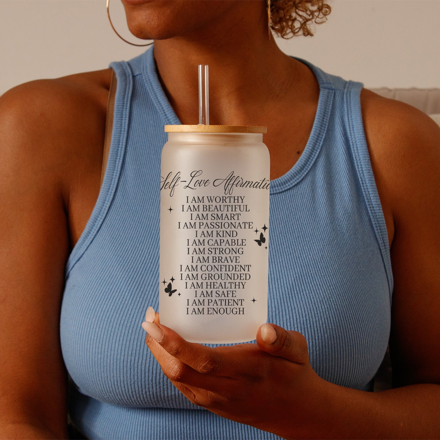 Self Love Affirmation Frosted and Clear Custom Iced Coffee Glass Can Tumblers - Frosted is backordered and will ship as soon as it is back in stock.