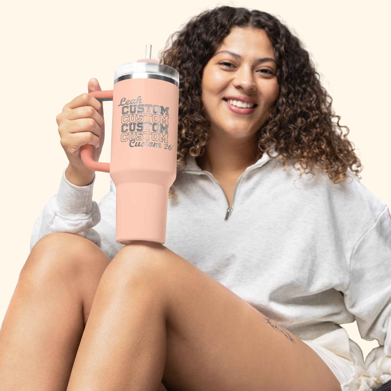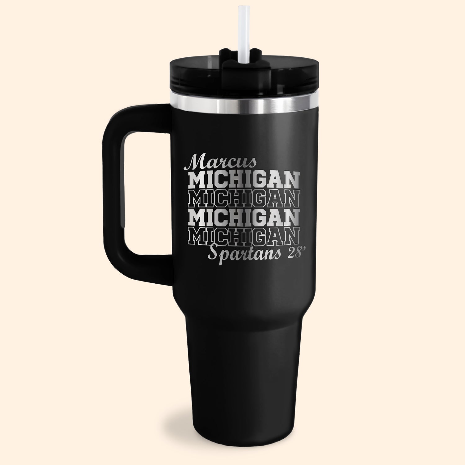 Show off your school pride with our Stacked School Name 40oz tumbler for college students. Customize the tumbler with your name, school name, mascot and graduation year. This custom college 40oz tumbler with handle is perfect for game days, college gifts for girls, college gifts for boys, personalized back to school gifts, and going off to college gifts.