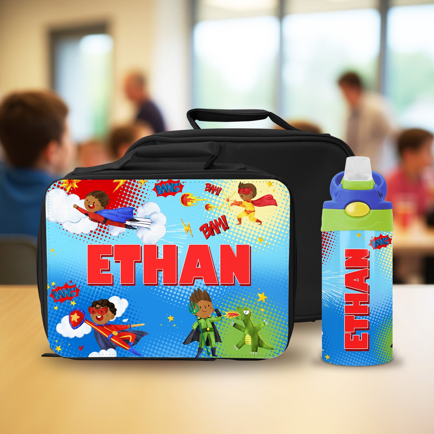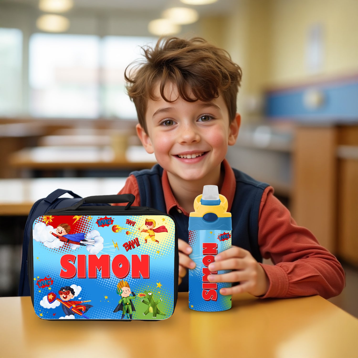 Superhero Back to School Gift for Boys, Personalized Lunch Box and Water Bottle with Name