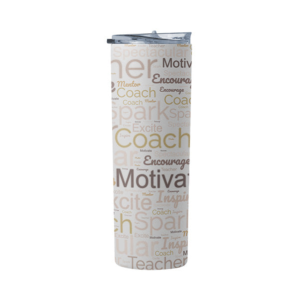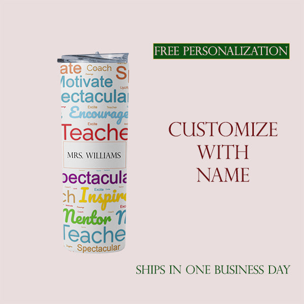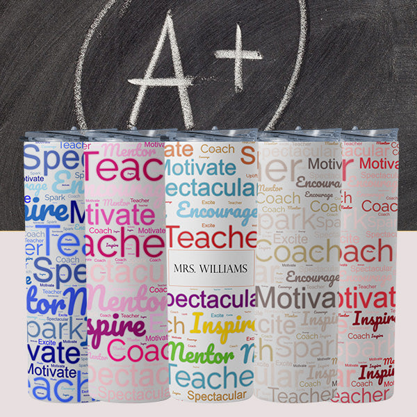 This tumbler for teachers is available in five color themes including multicolored, red, pink, blue and brown. It can be also personalized with the teacher's name.
