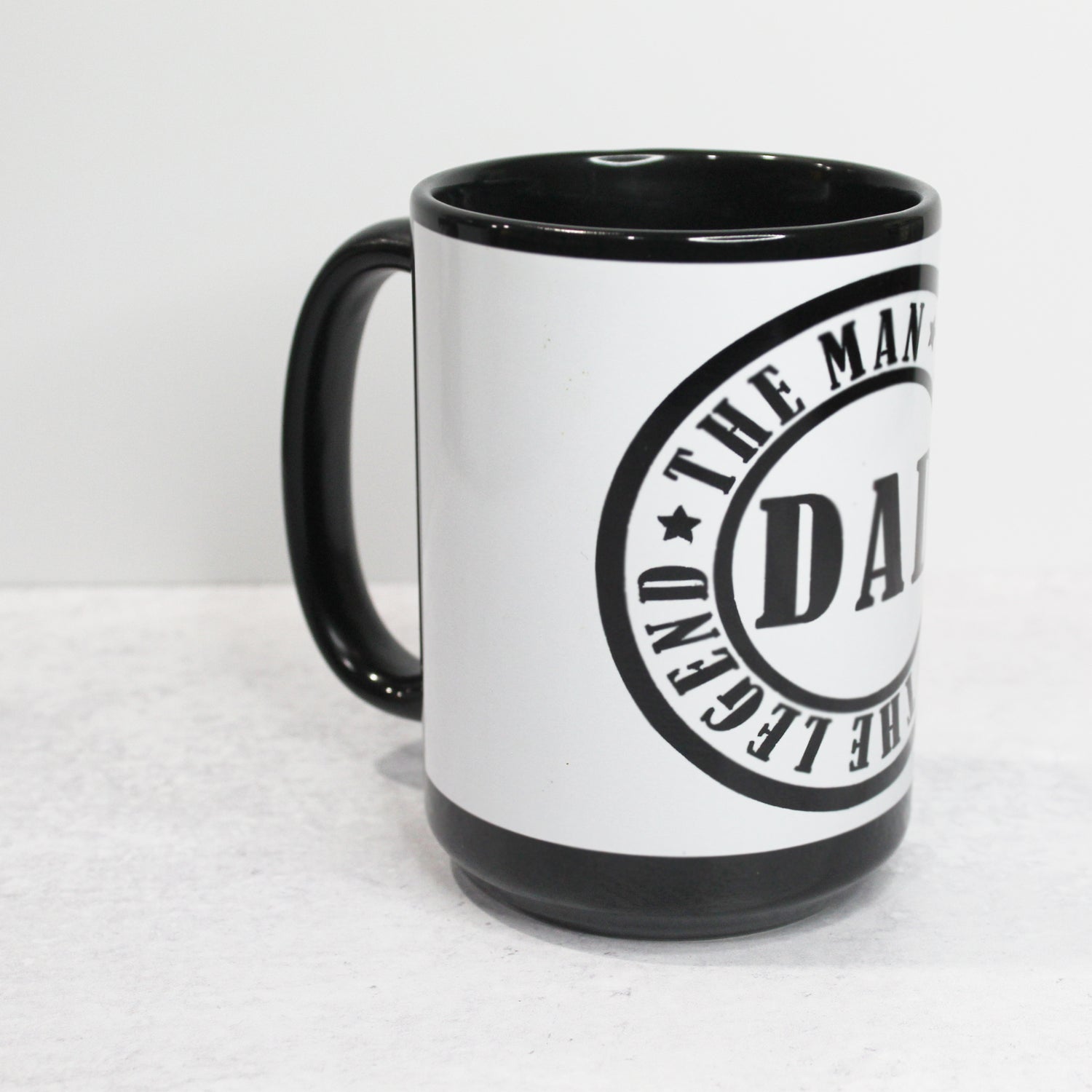 - This mug is dishwasher and microwave safe. The "The Man, The Myth, The Legend" ceramic mug has a 15 oz capacity, the design is in the center on the mug, and the black and white color of the mug gives a nice, unique look