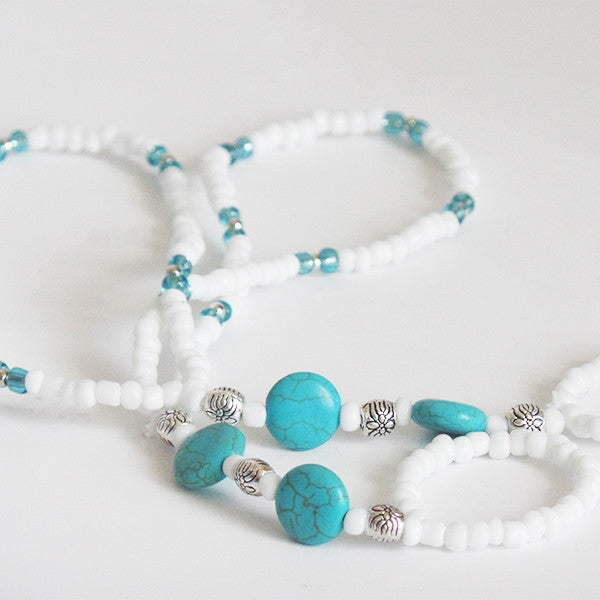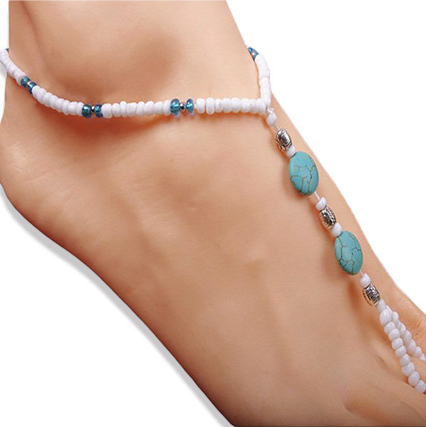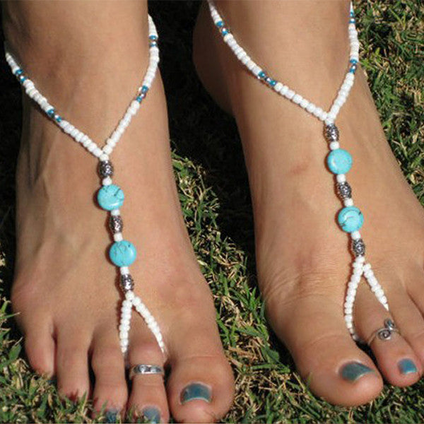 - Ideal beach wedding footwear that features turquoise blue medallions and white and sea glass blue beads
