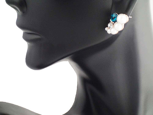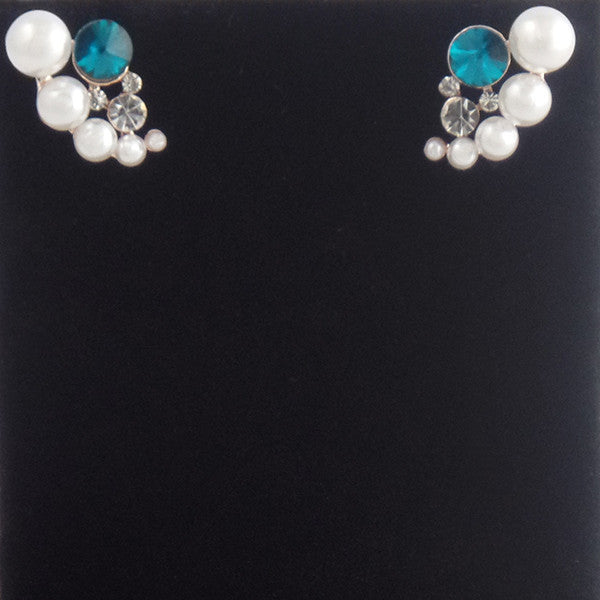 White Round Pearl Stud Earrings with Blue Rhinestone