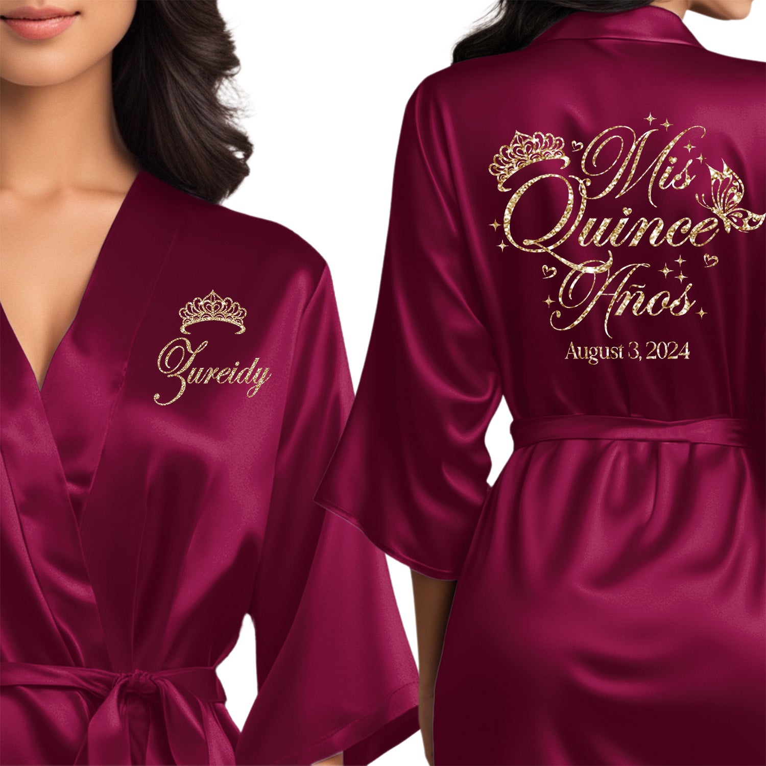Step into your Quinceañera celebration in style with our Personalized Satin Quinceañera Robe. Crafted for your special day, this personalized Quinceañera robe exudes luxury and elegance. Ideal for getting ready moments and capturing unforgettable photos, it features beautiful glitter and regular text color options to match your Quinceañera party. Perfect for your Quince birthday, our personalized robe is a symbol of sophistication and grace as you embark on this milestone journey. Make your Mis Quince celebration truly memorable with our personalized robe for every member of the party. chose from Mis Quince Anos, Mama de la Quinceañera, Abuela de la Quinceañera, Tia de la Quinceañera, Hermana de la Quinceañera, Quinceañera Squad, Damas de la Quinceañera and more.