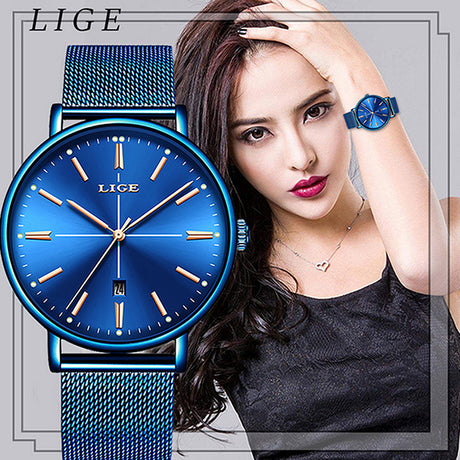 LIGE Womens Luxury Watch, Blue Face, Stainless Steel Mesh Band, 3 Bar