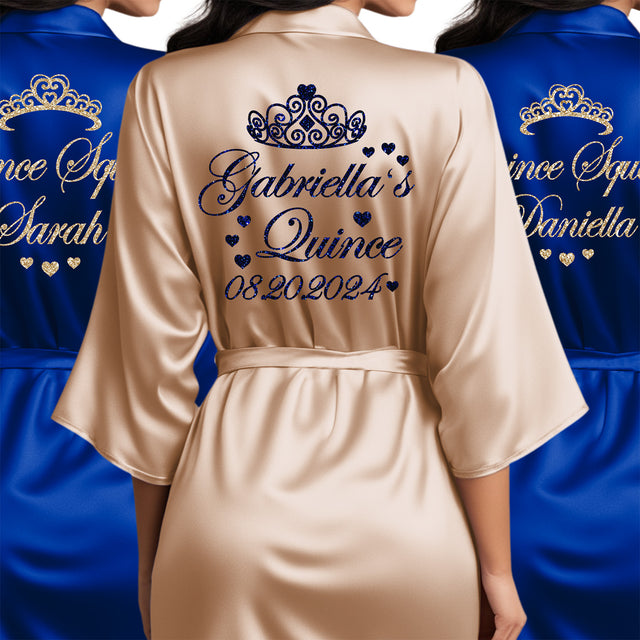 Beautiful and soft satin robes for Quinceanera. Personalize with the name of the Mis Quince and the event date. All personalizations are included in the price.