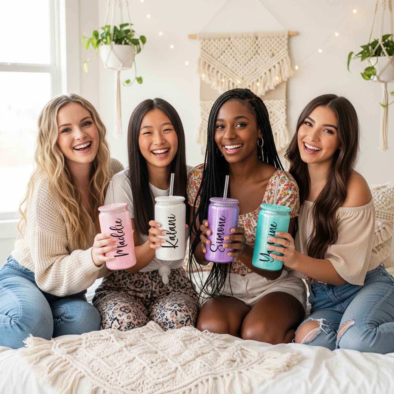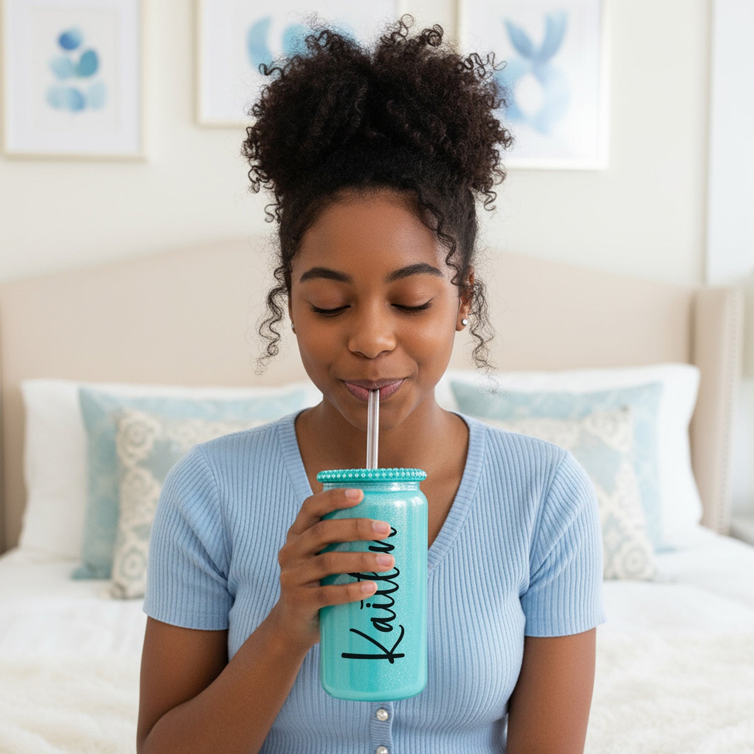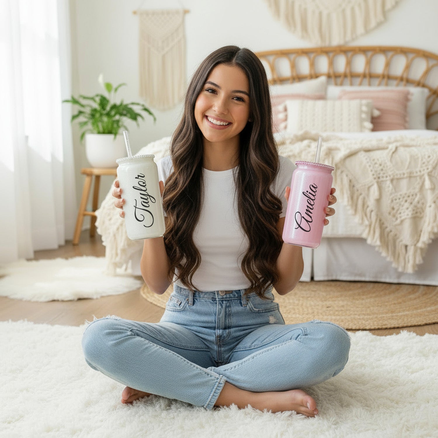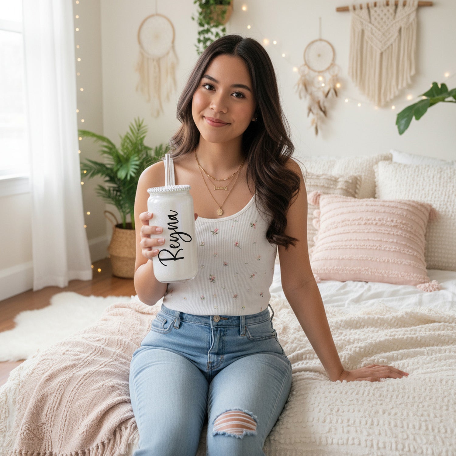 Made from high-quality glass with a reusable straw and shimmering rhinestone lid, this cup is perfect for everyday hydration or as a chic desk or vanity accessory. Choose from beautiful colors like pink, white shimmer, or teal, making it an unforgettable birthday, Christmas, or “just because” gift for someone who loves all things pretty and personalized.