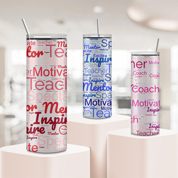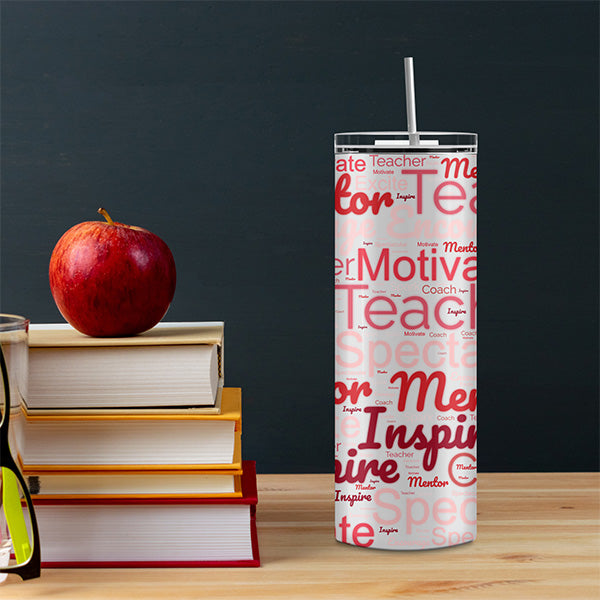 This tumbler for teachers is available in five color themes including multicolored, red, pink, blue and brown. It can be also personalized with the teacher's name.