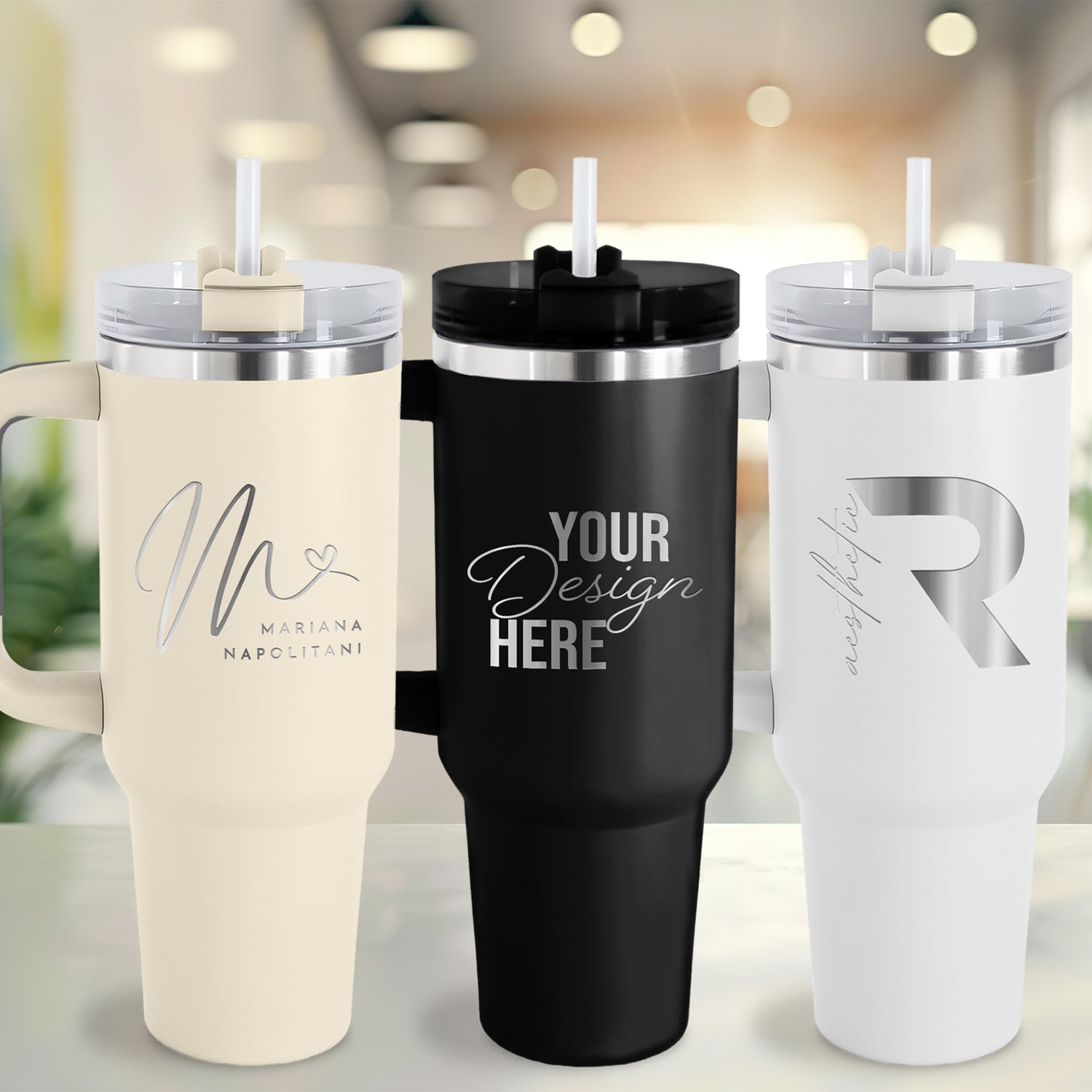 Not only are the 40oz tumblers great for custom business gifts, but they are great for any custom design. Send us your idea or high-quality image, and we will engrave the design for you. You can choose from our many font options to add your name only to the tumbler or a fun quote.