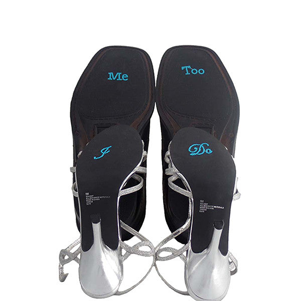 The I Do Me Too Shoe Stickers are elegant wedding shoe decals with the words “I Do” for Bride and “Me Too” for Groom. Rhinestones are blue so it can also work as the Bride’s Something Blue. Good adhesion and small enough to fit on most shoes. Easy to apply and remove. We will send instructions.