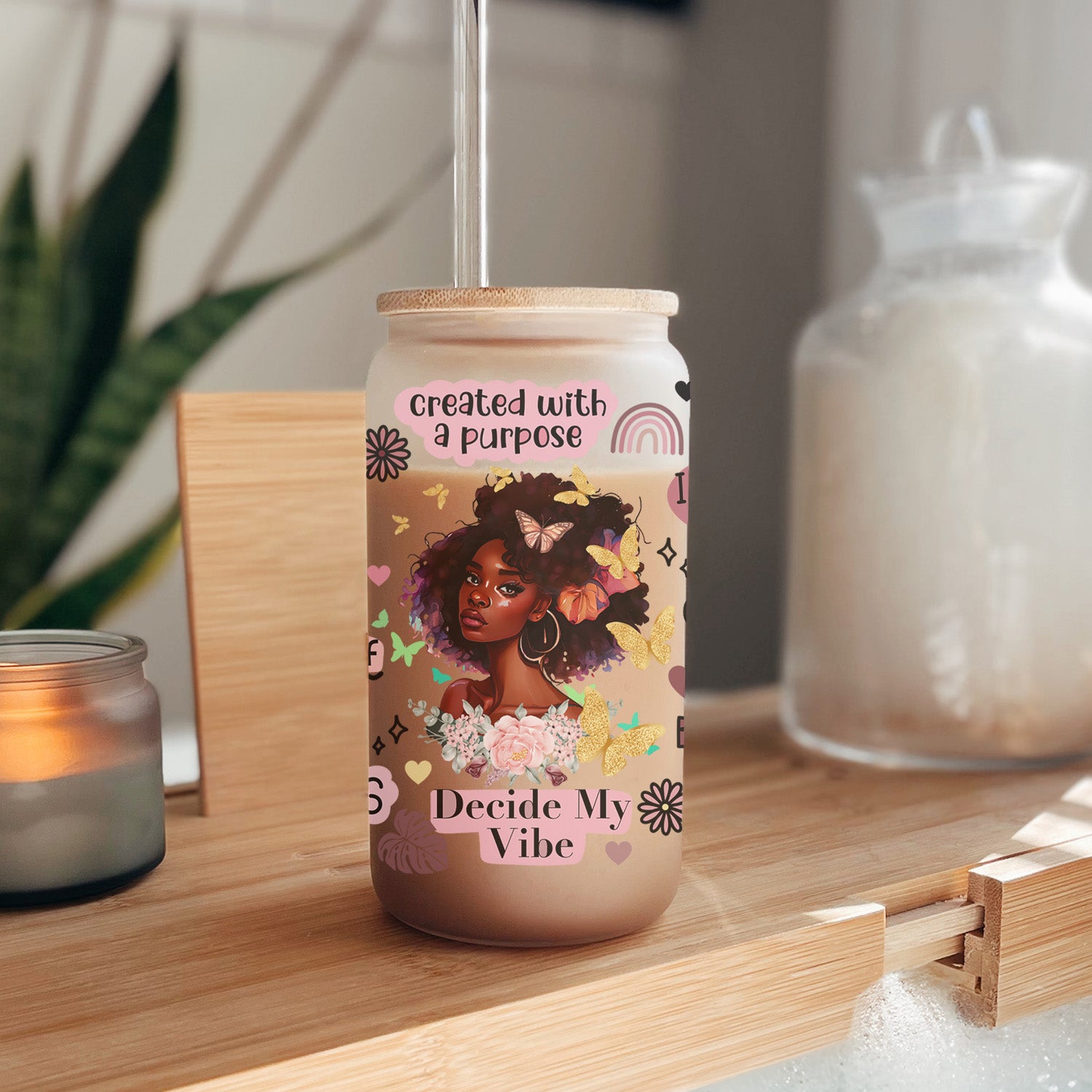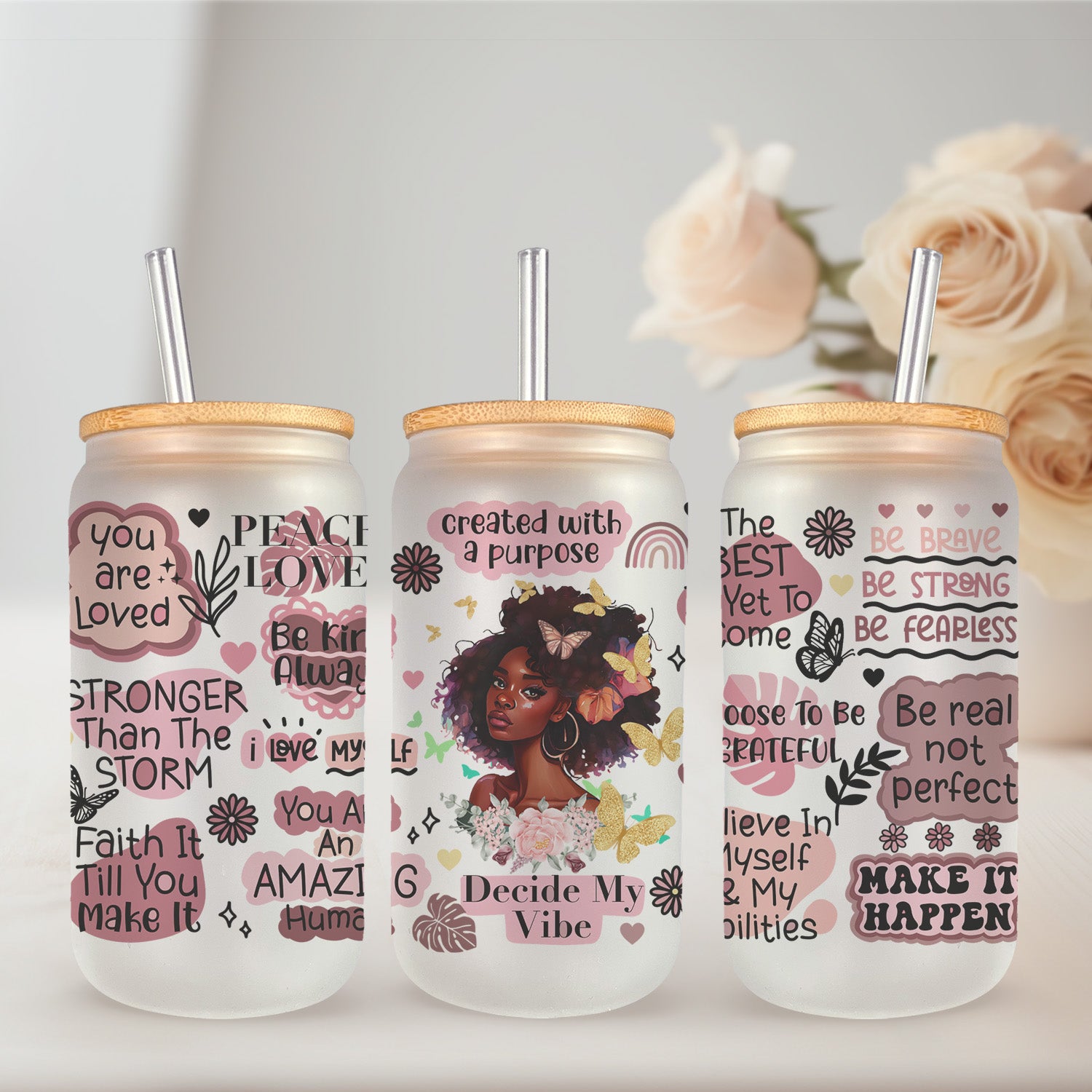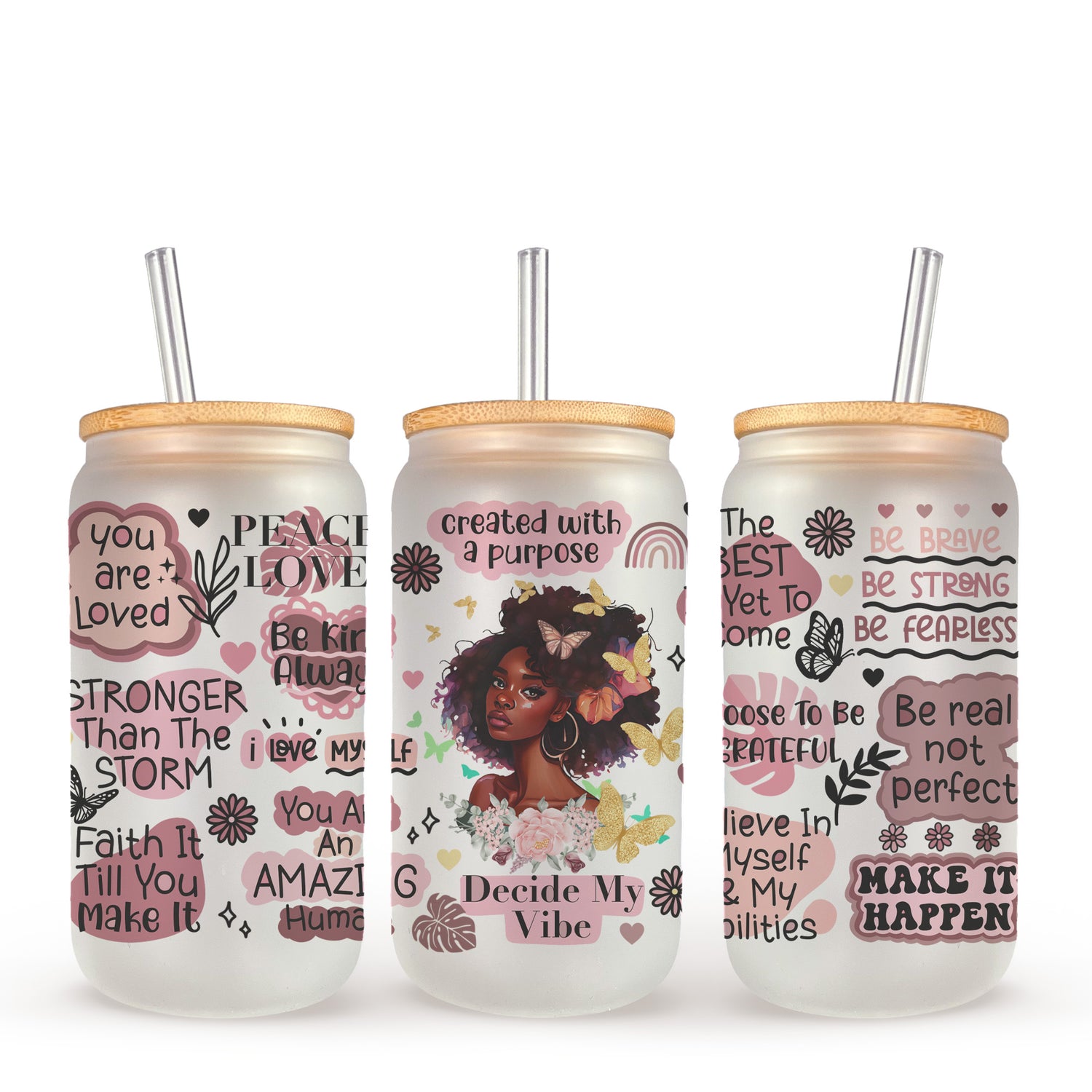 Stay inspired all day with our Black Girl Inspirational Quotes Frosted Iced Coffee Glass Cans! This 16oz motivational glass can tumblers feature daily affirmations to keep you encouraged and motivated throughout the day. Celebrate the magic of being a black girl with these inspirational quotes that highlight the strength, beauty, and resilience of black women. Elevate your daily routine with our motivational glass can tumblers.