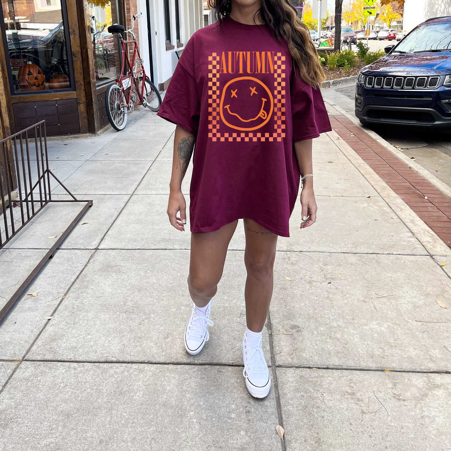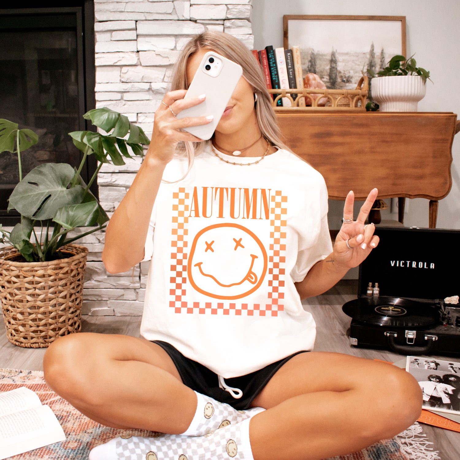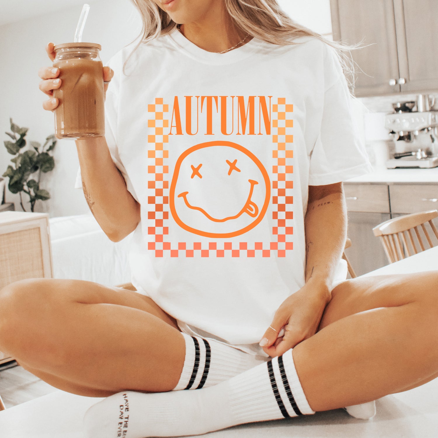 Trendy ombre Autumn t-shirt for the Fall season. Great for warmer Fall weather. Smiley face design on front.