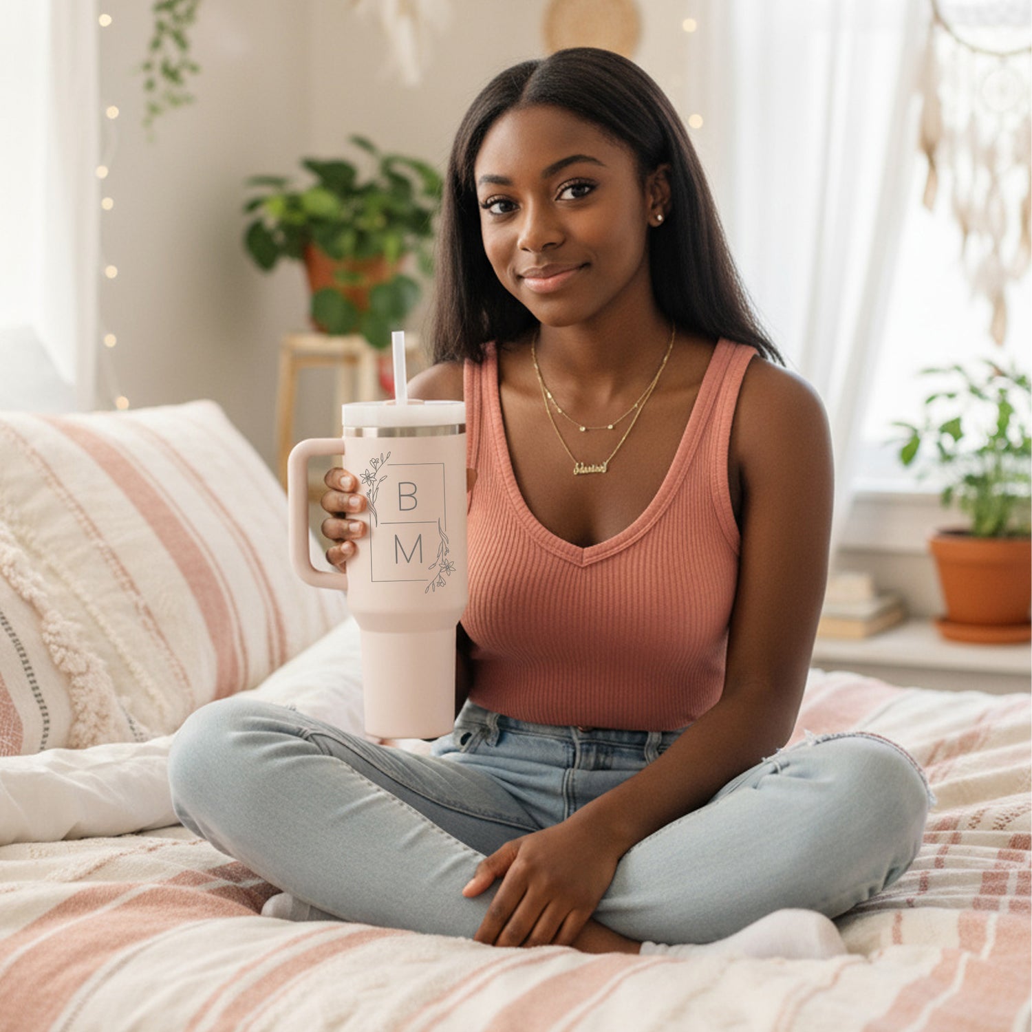 Stay hydrated in style with this Personalized 40oz Tumbler, featuring a beautiful wreath initial design and your custom name in elegant script. Perfect for women who love practical luxury, this tumbler combines function and sophistication — making it an ideal gift for her for birthdays, Christmas, or any special occasion.