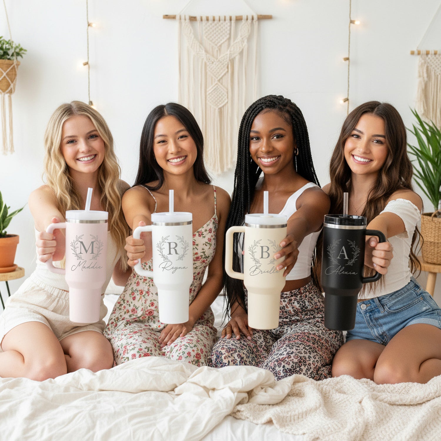 Stay hydrated in style with this Personalized 40oz Tumbler, featuring a beautiful wreath initial design and your custom name in elegant script. Perfect for women who love practical luxury, this tumbler combines function and sophistication — making it an ideal gift for her for birthdays, Christmas, or any special occasion.