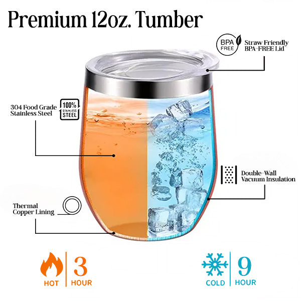 Our 12oz wine tumblers are safe and durable. They can be easily held in your hand and will fit in most car cup holders. They feature double wall insulation and will keep drinks warm for up to 3 hours or cold for up to 9 hours. A great bridesmaid cup for all types of liquids. They ship with lid, straw, each package in an individual box for safety.