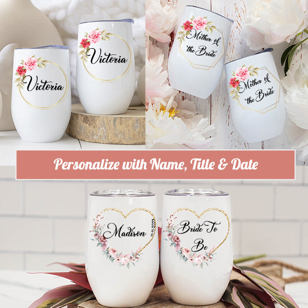 These personalized wine tumblers are great for the entire bridal party including bride, bridesmaids, maid of honor, matron of honor, bride, mother of the bride, mother of the groom, sister of the bride, aunt of the bride etc. Gift to your wedding planner and other coordinators.
