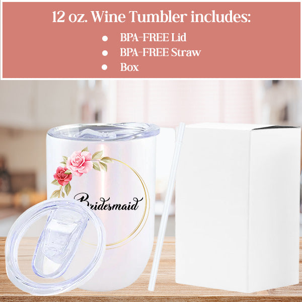 Our 12oz wine tumblers are safe and durable. They can be easily held in your hand and will fit in most car cup holders. They feature double wall insulation and will keep drinks warm for up to 3 hours or cold for up to 9 hours. A great bridesmaid cup for all types of liquids. They ship with lid, straw, each package in an individual box for safety.