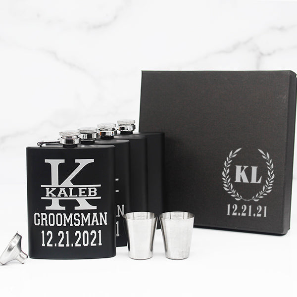 Personalized Matte Black 7oz Groomsmen Flask Set, Includes 4 Flasks, 2 Shot Glasses & Gift Box