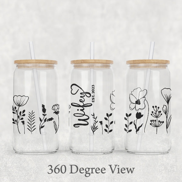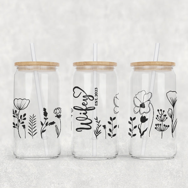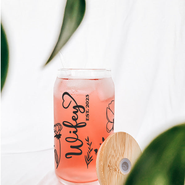 Simple Floral Wifey Iced Coffee Glass Tumbler Personalized with Year Established