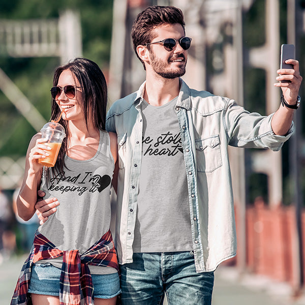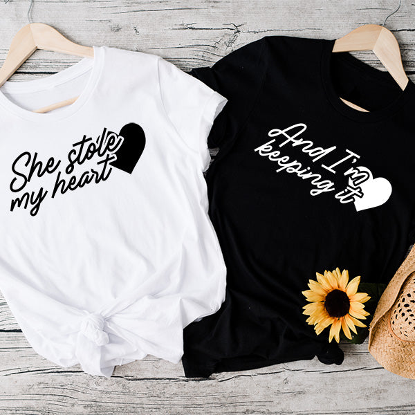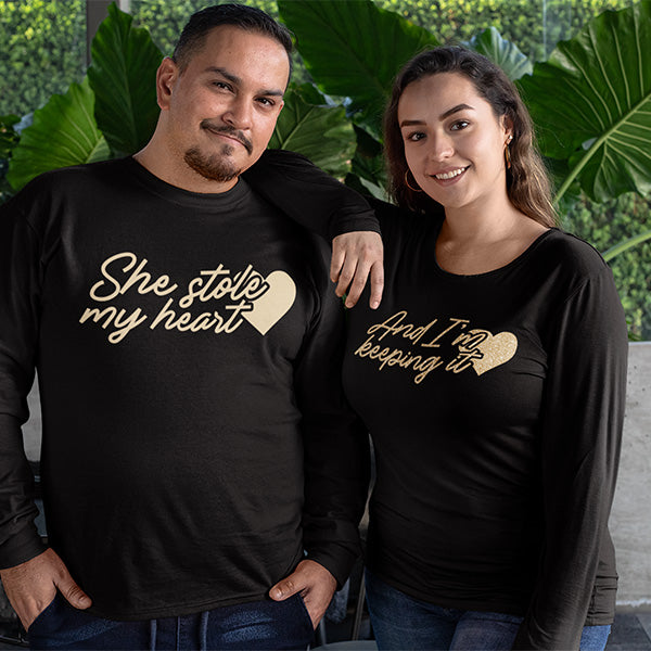 Funny couple shirts with the phrases "She Stole My Heart and I'm Keeping It". With a variety of top styles to choose from, each person can be comfortable and show their personality. Choose from t-shirts, tank tops, crop tops, hoodies, sweatshirts and long-sleeved tees. Just a cute shirt for any occasion, whether it's couples game night, date night, honeymoon, anniversary etc. Great matching outfit for newlyweds.