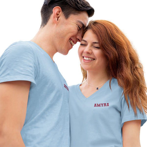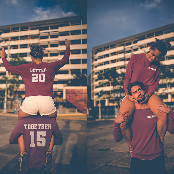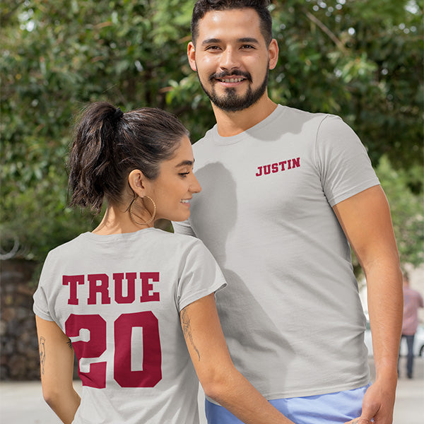Cute couple matching shirts that can be customized with any short text on the front and back. Use for Valentine's Day, Honeymoon, Date Night, Anniversary and more. Choose from text such as True Love, Better Together, Forever Always and In Love Since, or send in one of your own. These couple jerseys make great couple gifts as well.