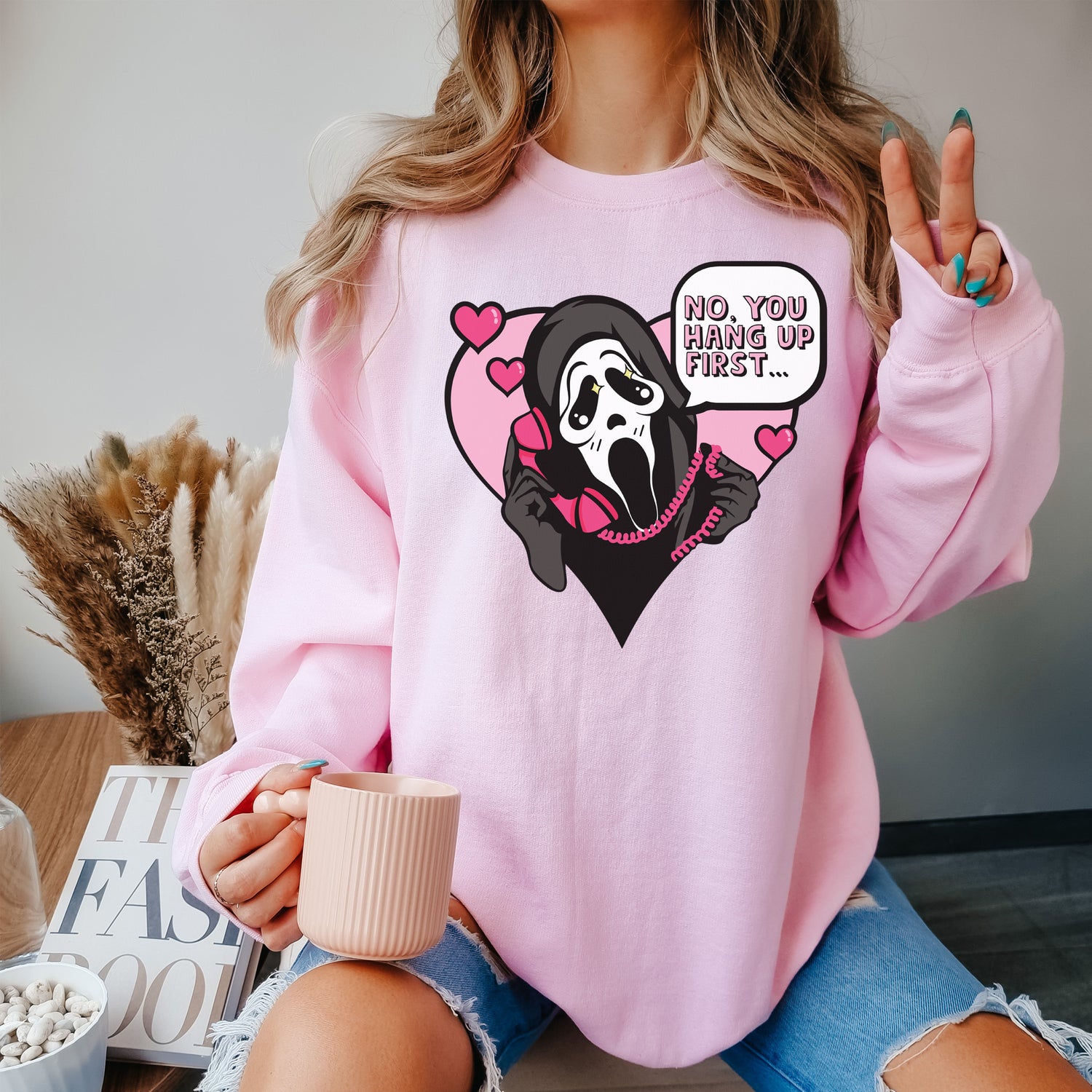 The iconic, "No you hang up first" phrase said by Ghostface. A cute, but still spooky Halloween sweatshirt available in a variety of colors.