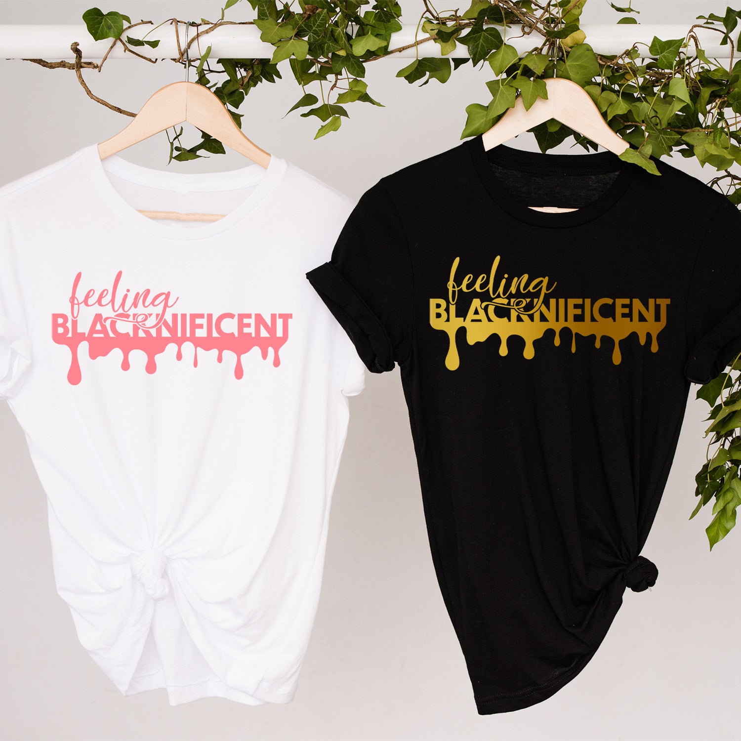 Feeling Blacknificent Shirt that's not just great for Black History Month or Juneteenth but to wear all year long. Choose from standard print or glitter print. It's simple, stylish and bold all at the same time. A great unisex black pride or Black Lives Matter shirt for all ages.