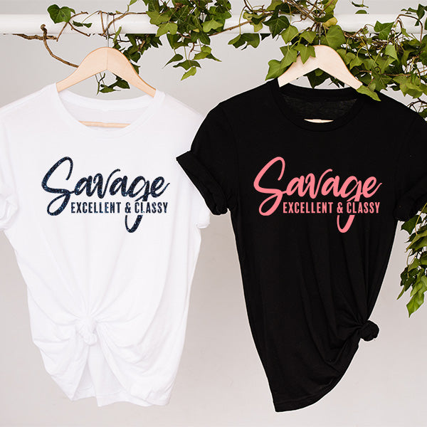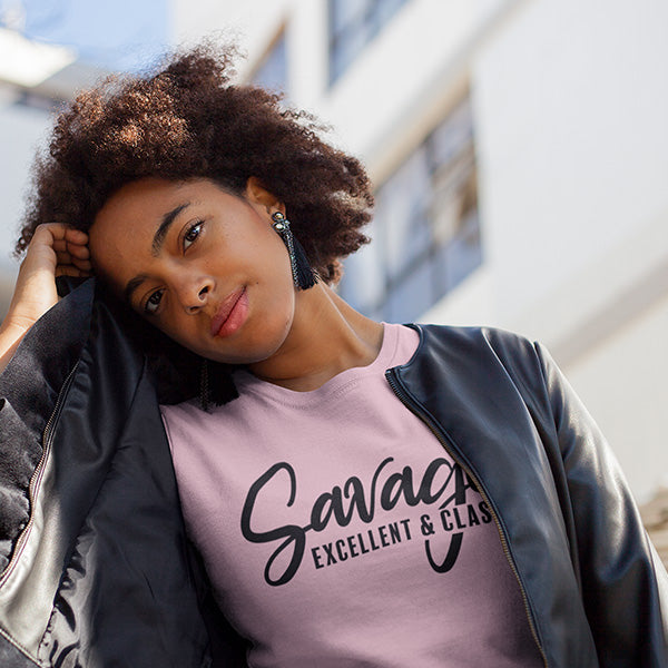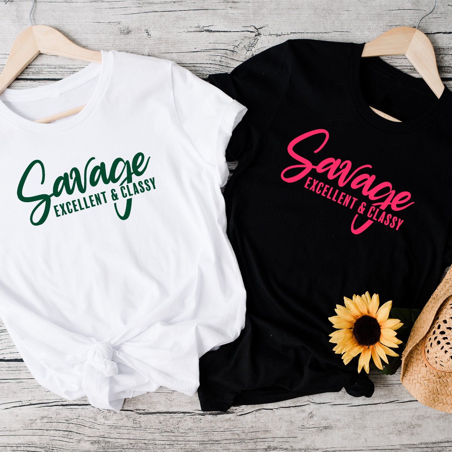This shirt features a minimalistic design with the phrase Savage Excellent & Classy. A great self-love shirt for girls, teens and women of all ages. Shirts fit comfortably and various styles and colors are available. Be confident and stylish in this classy but sassy shirt!