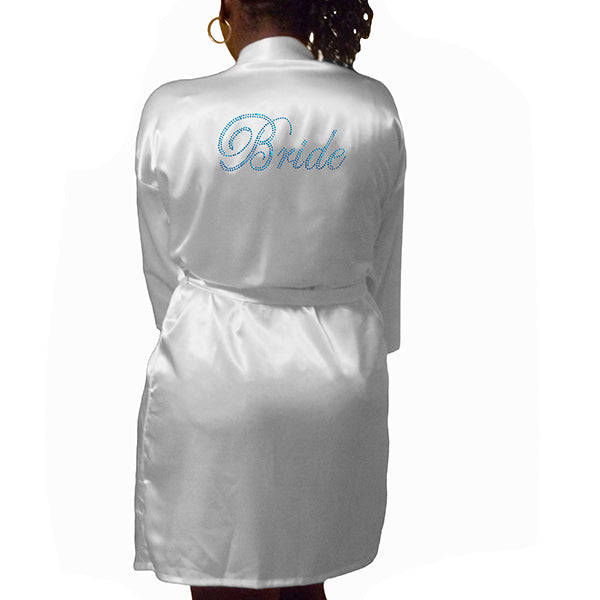 - Robes are engraved with silver or blue rhinestones with the word Bride on back