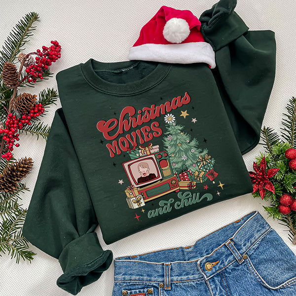 Cute and comfy Christmas Movies and Chill holiday sweatshirt. Best sweatshirt to wear while enjoying your favorite Christmas movies and drinking hot cocoa. Also available as a frosted iced coffee cup.