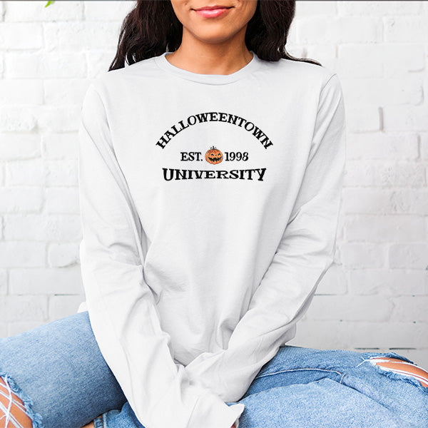 Comfortable sweatshirts, hoodies & long sleeve t-shirts with Halloweentown University Design. These Halloween Shirts are available in a wide array of sizes and colors. Super cute to show your Halloween spirit. This Halloween Sweatshirt has a Halloweentown University text in the front and showcases a decent length design in the back.