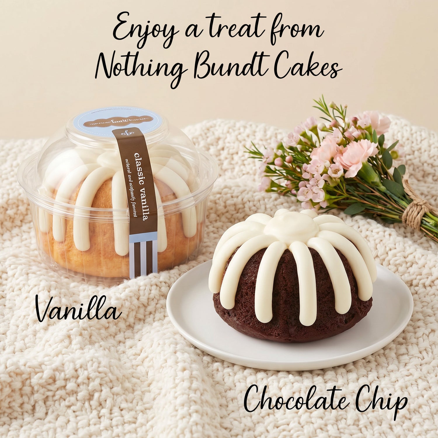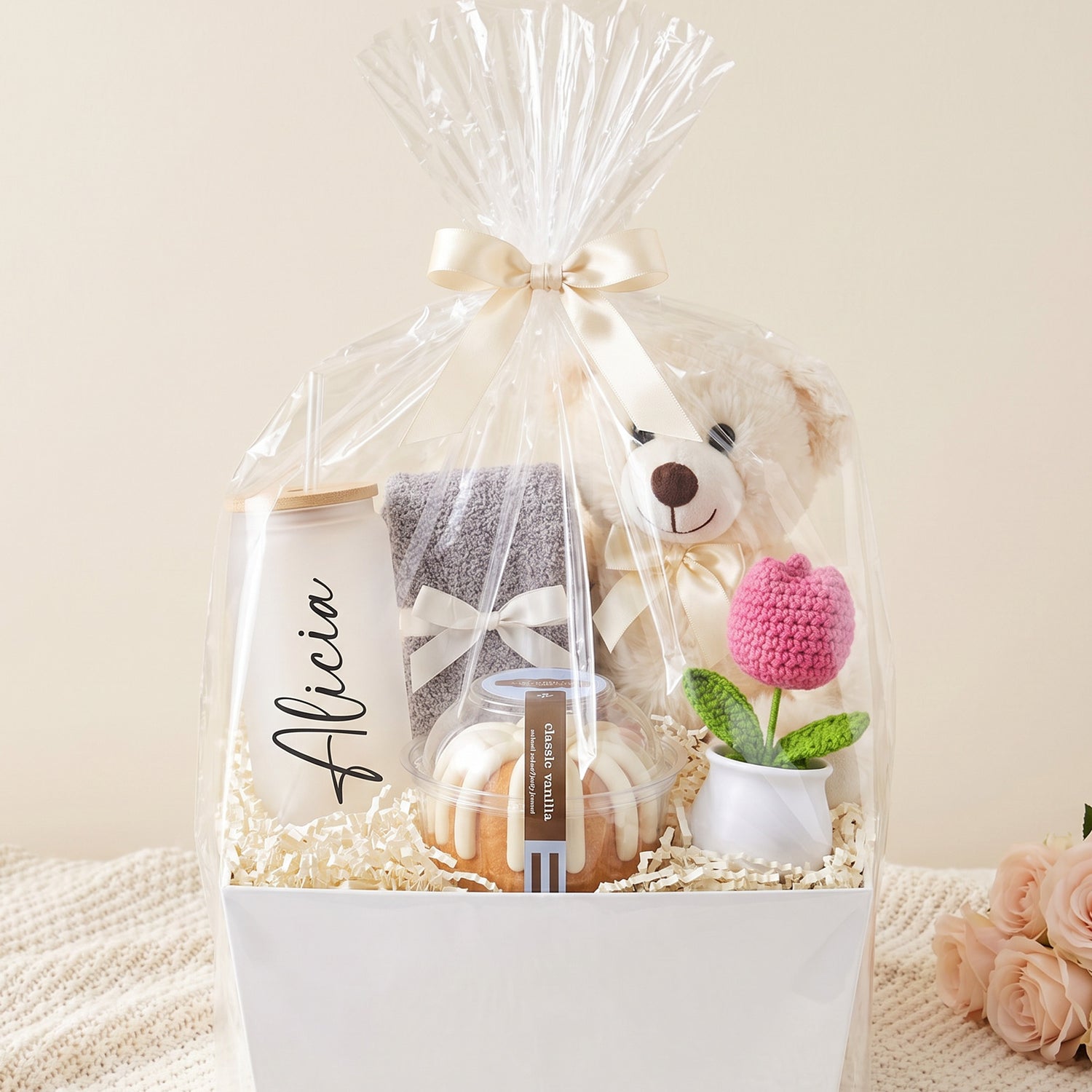 Our Cozy Cake Break Mom Gift Basket is the ultimate all-in-one gift for Mother’s Day, birthdays, or Christmas—thoughtfully designed to bring comfort, sweetness, and a moment of relaxation all in one beautiful package. This elegant gift set includes a soft plush teddy bear, a personalized iced coffee glass tumbler, fuzzy socks, a surprise color crochet flower and a delicious gourmet bundt cake from Nothing Bundt Cakes (not affiliated), with your choice of classic vanilla or rich chocolate chip flavor. Each basket is carefully arranged and wrapped to create a stunning presentation that feels just as special as the gift inside.