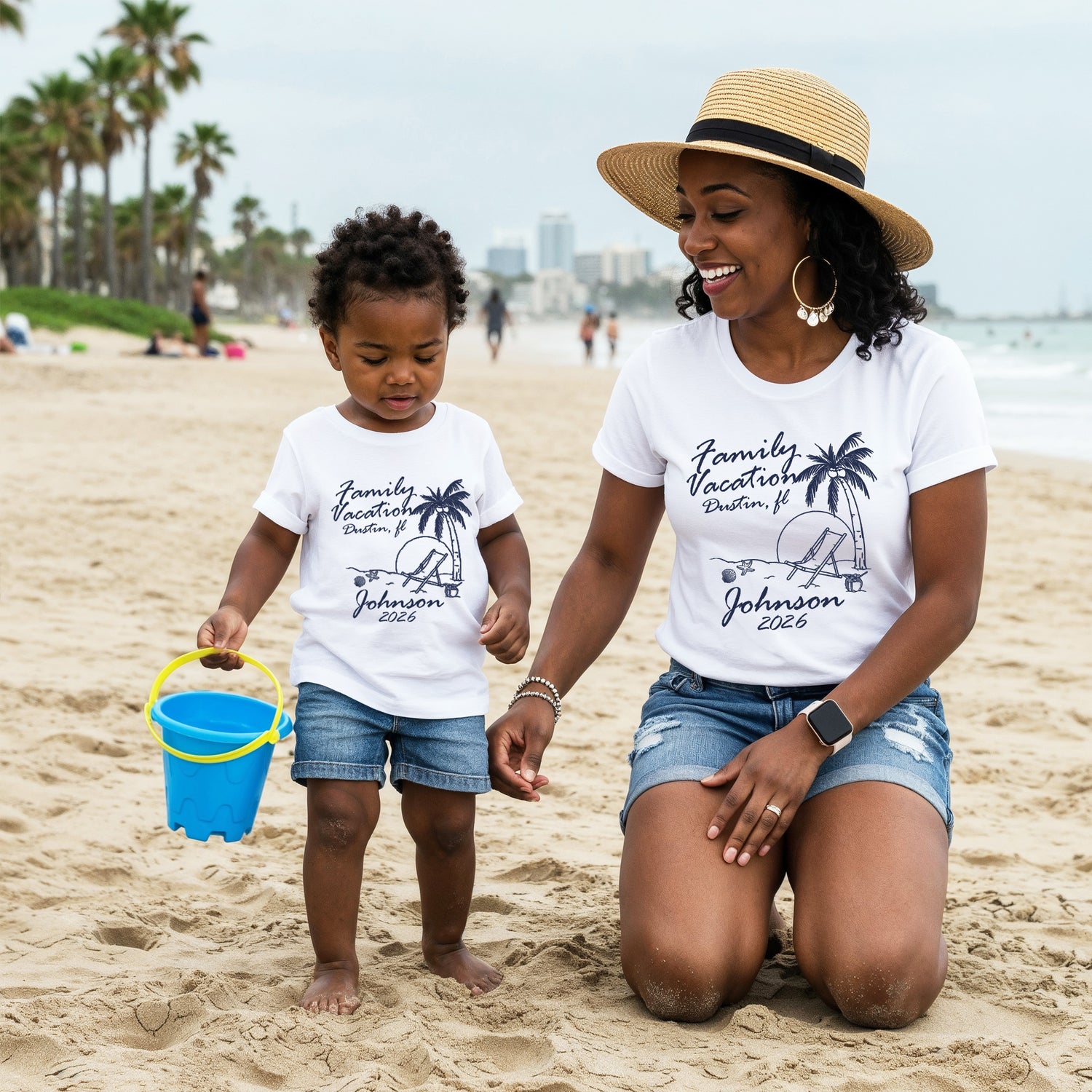Our matching personalized family vacation tees feature a custom name are perfect for beach outings, family reunions, summer vacations, and group photos. Whether you need custom matching tees for family beach vacations, personalized family shirts for summer trips, or custom family reunion beach shirts, these tees deliver style and unity.
