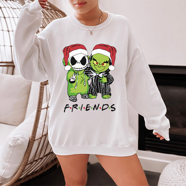 Cute Jack and The Grinch Friends Christmas Sweatshirt for Kids and Adults - White / S is backordered and will ship as soon as it is back in stock.