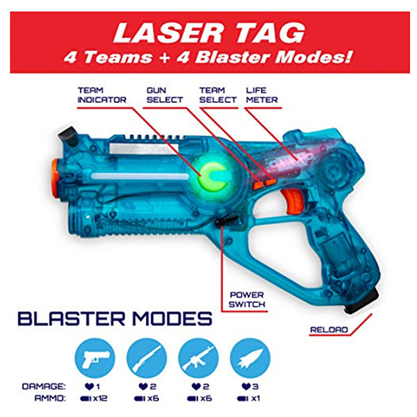 These laser tag games include 2 laser blasters with child-safe infrared sensors (less than 1mW output) and 2 rechargeable light up hovering target drones. Each blast comes with a target sensor built in so no vest is required.  These toy guns feature 130-ft. range, life meter, sound FX, ammo reload buttons, LED lights, and vibration feedback; guns require (4) AAA batteries.  Great for indoor or outdoor play. Recommended for ages 6 and up.