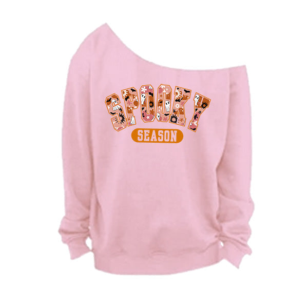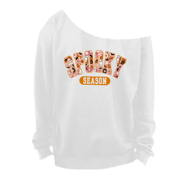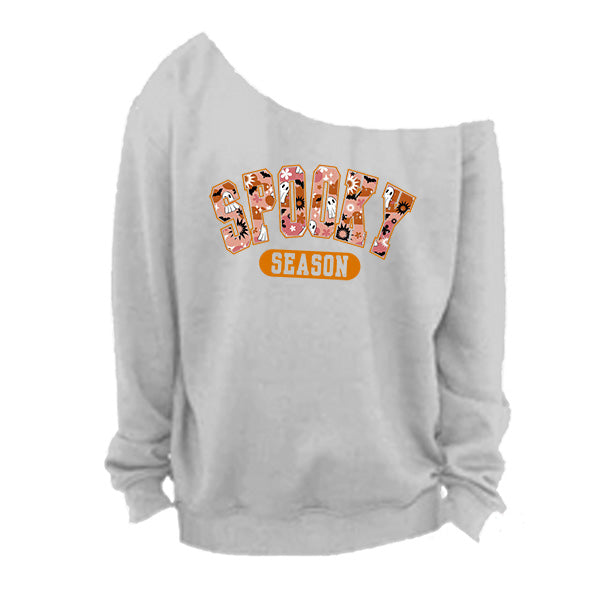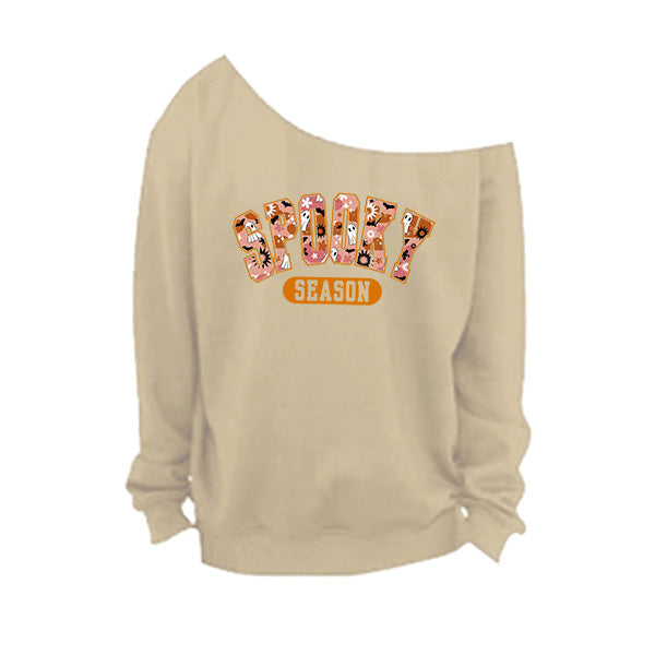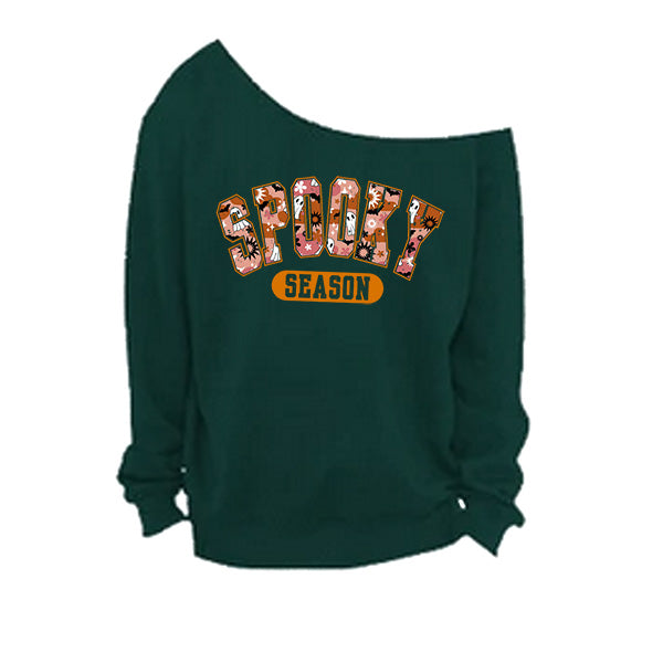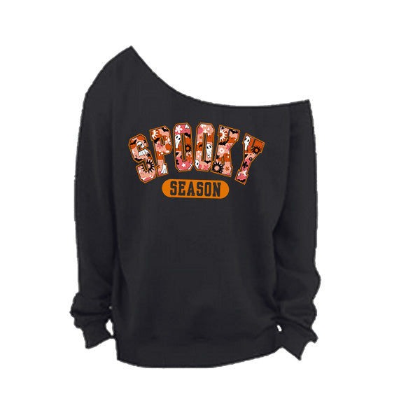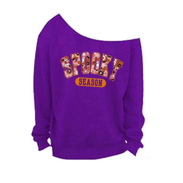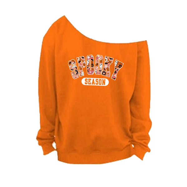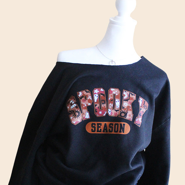 Style up your Halloween wear with our off the shoulder Spooky Season sweatshirt in 7 colors and 8 sizes so everyone gets a great fit. These cold shoulder style Halloween shirts are available in small to 5XL women plus sizes. These are oh so comfortable to wear and features a raw edge oversized neckline. The neckline is hand cut, so no two will look the same. Go for a trendy oversized look by sizing up. All printing and customizations are done in-house in Frisco, TX.