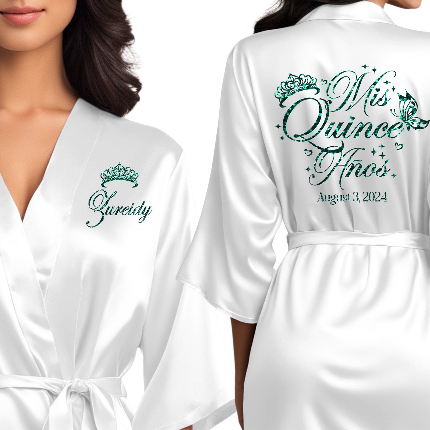 Step into your Quinceañera celebration in style with our Personalized Satin Quinceañera Robe. Crafted for your special day, this personalized Quinceañera robe exudes luxury and elegance. Ideal for getting ready moments and capturing unforgettable photos, it features beautiful glitter and regular text color options to match your Quinceañera party. Perfect for your Quince birthday, our personalized robe is a symbol of sophistication and grace as you embark on this milestone journey. Make your Mis Quince celebration truly memorable with our personalized robe for every member of the party. chose from Mis Quince Anos, Mama de la Quinceañera, Abuela de la Quinceañera, Tia de la Quinceañera, Hermana de la Quinceañera, Quinceañera Squad, Damas de la Quinceañera and more.