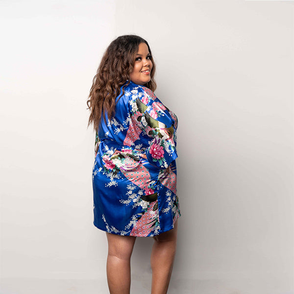 - Our kimono robes features a floral and peacock design that are carried throughout the robe in front, back and sleeves